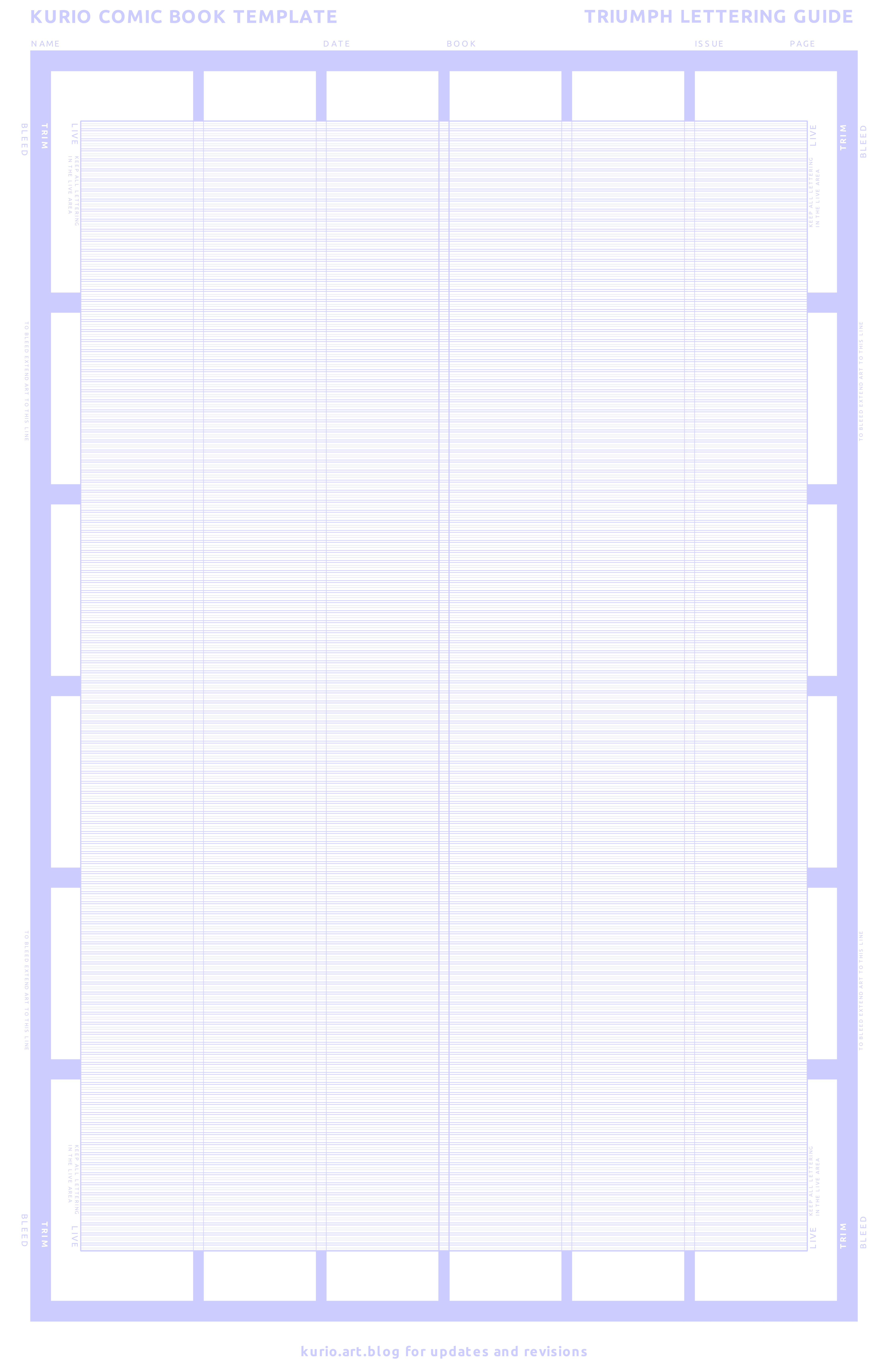 600 dpi comic book template based on the dimensions and recommended scale of famous blueline art board. The grid is intended to help keep your eye focused correctly while drawing digitally, but can also be used as a lettering guide.
